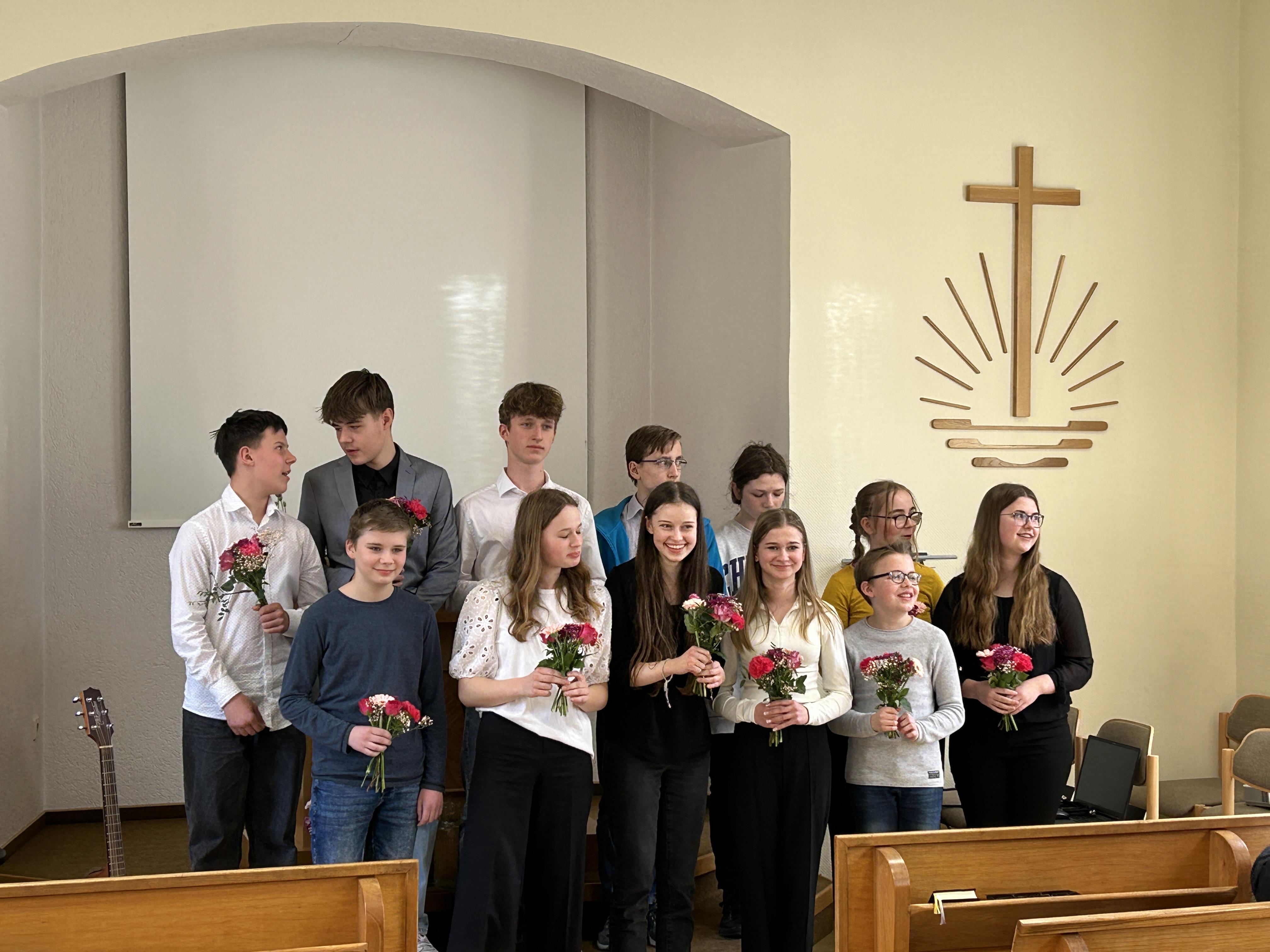 Am Ende wurden wir in der Jugend vorgestellt und willkommen geheißen. Jeder Konfirmand hat einen schönen Strauß Blumen bekommen.